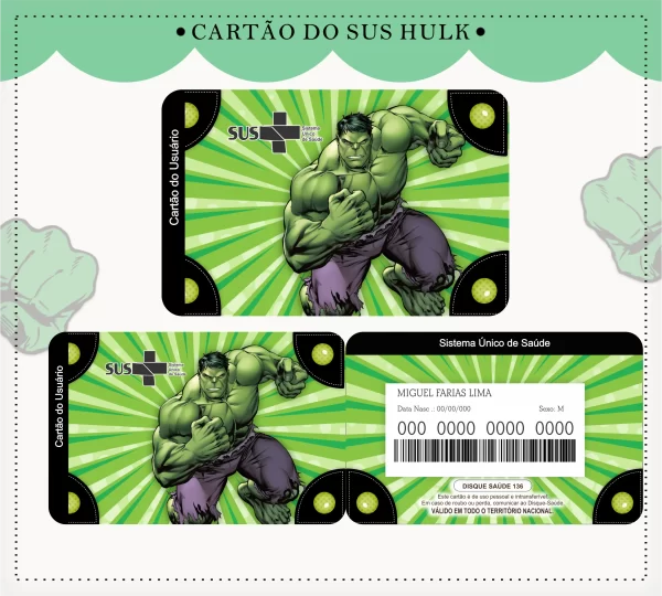 Adquira agora o seu Arquivo Cartão Sus Hulk Pdf e Png digital pronto para impressão! Este é um modelo de alta qualidade, criado especialmente para quem busca praticidade no dia a dia. Ou seja, é ideal para quem precisa de uma personalizada, funcional e acessível do cartão do Sistema Único de Saúde (SUS),