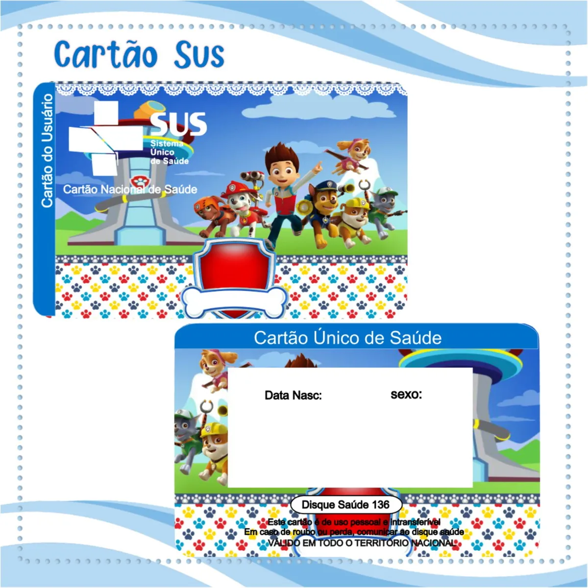 Adquira agora o seu Arquivo Cartao Sus Patrulha Canina Png digital pronto para impressão! Este é um modelo de alta qualidade, criado especialmente para quem busca praticidade no dia a dia. Ou seja, é ideal para quem precisa de uma personalizada, funcional e acessível do cartão do Sistema Único de Saúde (SUS),