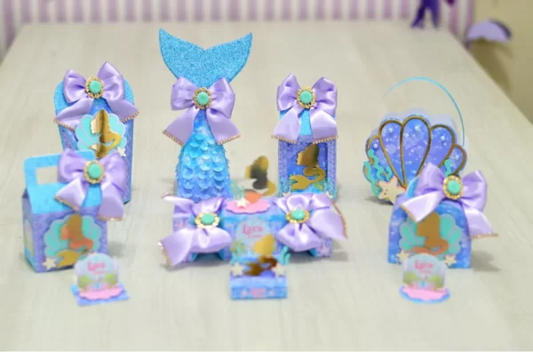 Além disso, você pode combinar o arquivo com balões coloridos, glitter, elementos aquáticos e detalhes em tons de azul, roxo e rosa, criando um cenário completo e submerso. Dessa forma, cada convidado se sente imerso em um mundo mágico, tornando a comemoração inesquecível.
