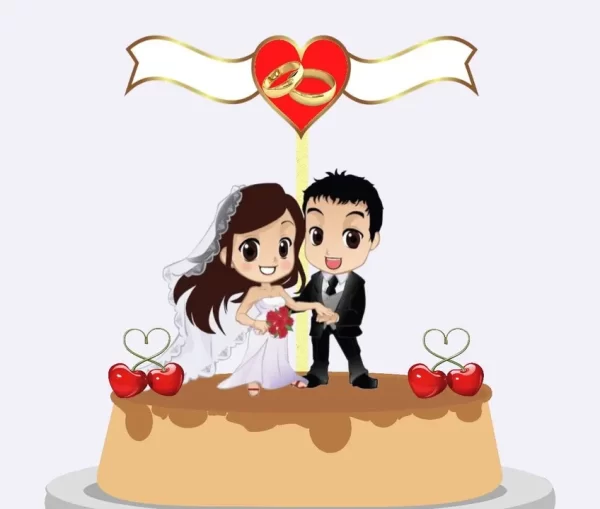 Topo de bolo com elementos de casamento (noivos, corações ou detalhes românticos);