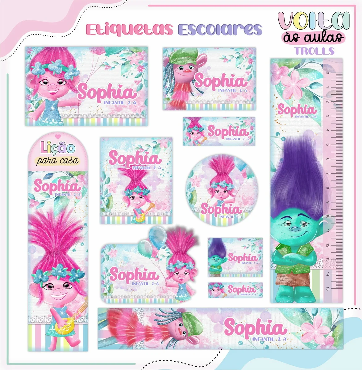 ✨ O Que Está Incluído no Produto? Arquivo Etiqueta Escolar Trolls