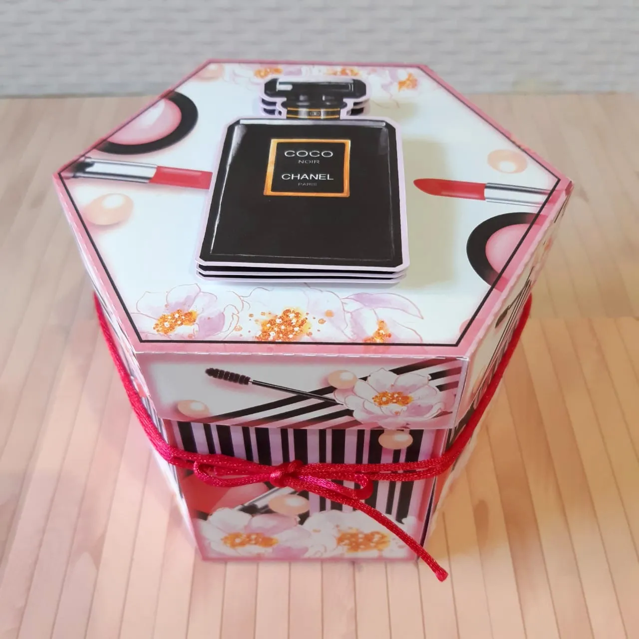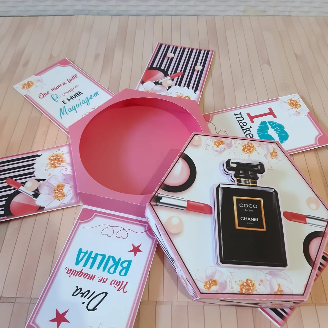 Com elementos temáticos de maquiagem – como batons, pincéis e espelhos – a caixa se abre revelando compartimentos internos decorados, que você pode preencher com doces, bilhetes ou pequenos presentes. É uma lembrança sofisticada e feita à mão.