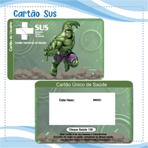 Adquira agora o seu Cartao do sus Personalizado Hulk Png digital pronto para impressão! Este é um modelo de alta qualidade, criado especialmente para quem busca praticidade no dia a dia. Ou seja, é ideal para quem precisa de uma personalizada, funcional e acessível do cartão do Sistema Único de Saúde (SUS),