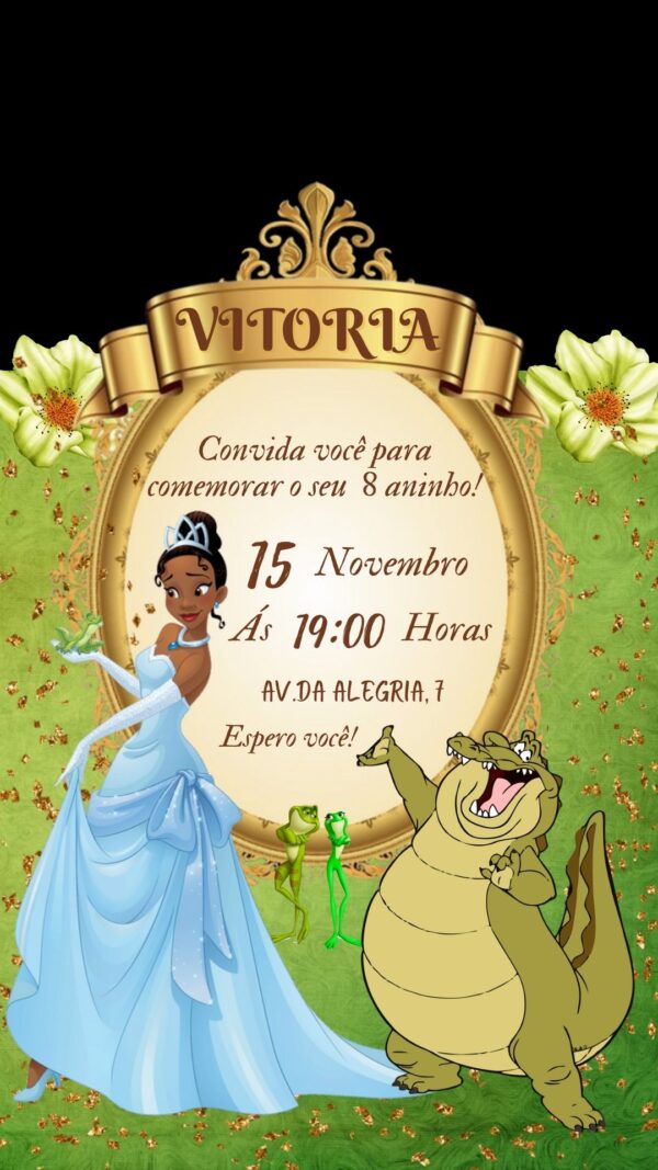 Além de ser prático, o convite animado A Princesa e o Sapo em vídeo MP4 é ecológico, evitando desperdício de papel. Ele também se torna uma linda lembrança digital do evento, que pode ser guardada para sempre como parte da memória desse momento especial.
