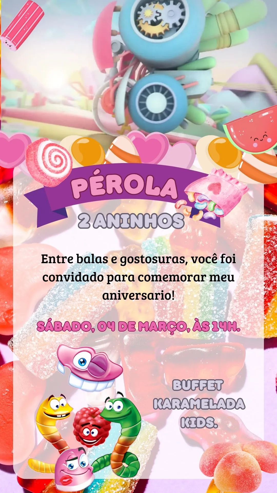 Com animações envolventes e detalhes que remetem ao universo das balas e gelatinas, o convite cria uma experiência visual irresistível. Assim, seus convidados já entram no clima da festa de forma única e especial.