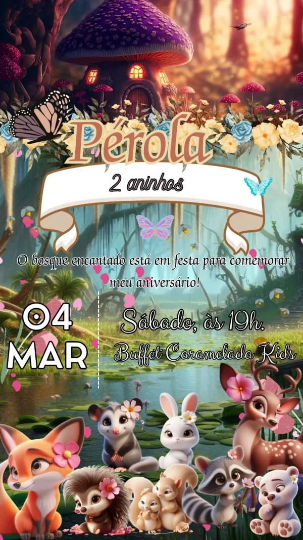 O convite animado Bosque Encantado Menina em vídeo MP4 é perfeito para quem deseja criar uma atmosfera mágica e delicada para comemorar momentos especiais. Inspirado no universo encantado dos bosques, este convite digital traz elementos como flores, animais delicados, fadas e luzes suaves que encantam desde o primeiro instante. Ideal para aniversários infantis, chás de bebê, batizados e outras celebrações femininas, o vídeo transmite toda a beleza e leveza que o evento merece.
