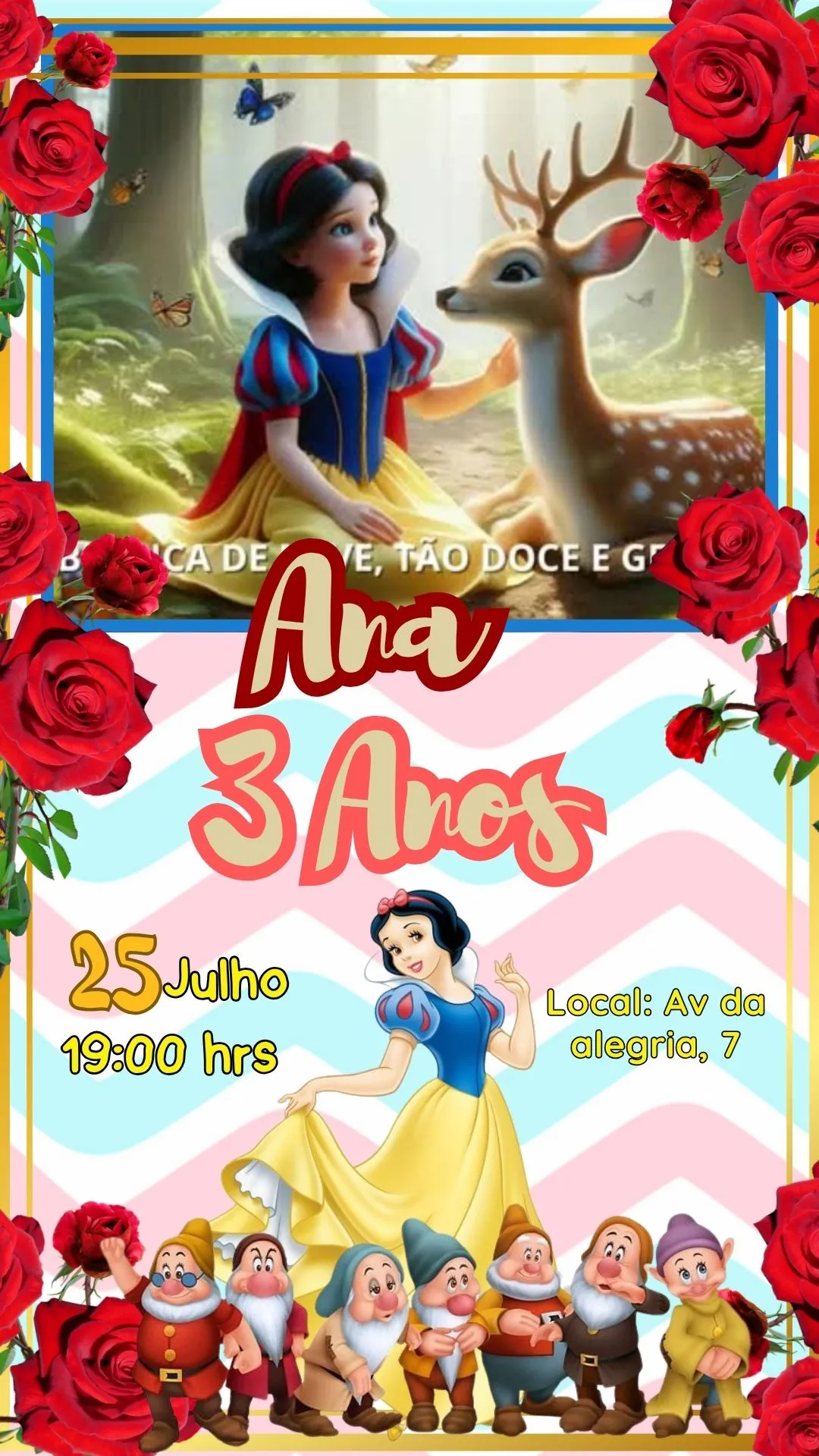 Ideal para aniversários infantis e festas temáticas, o convite traz os elementos tradicionais da história, como Branca de Neve, os sete anões, a maçã e a floresta encantada, tudo com um toque moderno e animado que prende a atenção dos convidados desde o primeiro segundo.