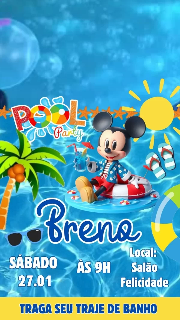 O convite animado Mickey Pool Party em vídeo MP4 é a escolha perfeita para quem deseja anunciar uma comemoração alegre, colorida e com clima de verão. Inspirado no personagem mais querido da Disney, o convite combina animações vibrantes, elementos aquáticos e uma atmosfera descontraída, ideal para festas na piscina e aniversários temáticos.