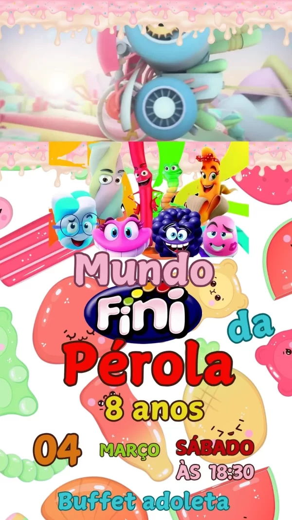 O convite animado Mundo Fini em vídeo MP4 é perfeito para transformar o anúncio da sua festa em uma explosão de cores, alegria e doçura. Inspirado no universo divertido das guloseimas Fini, esse convite digital é ideal para aniversários, festas infantis e eventos temáticos, trazendo animações vibrantes e elementos que remetem ao mundo mágico dos doces.