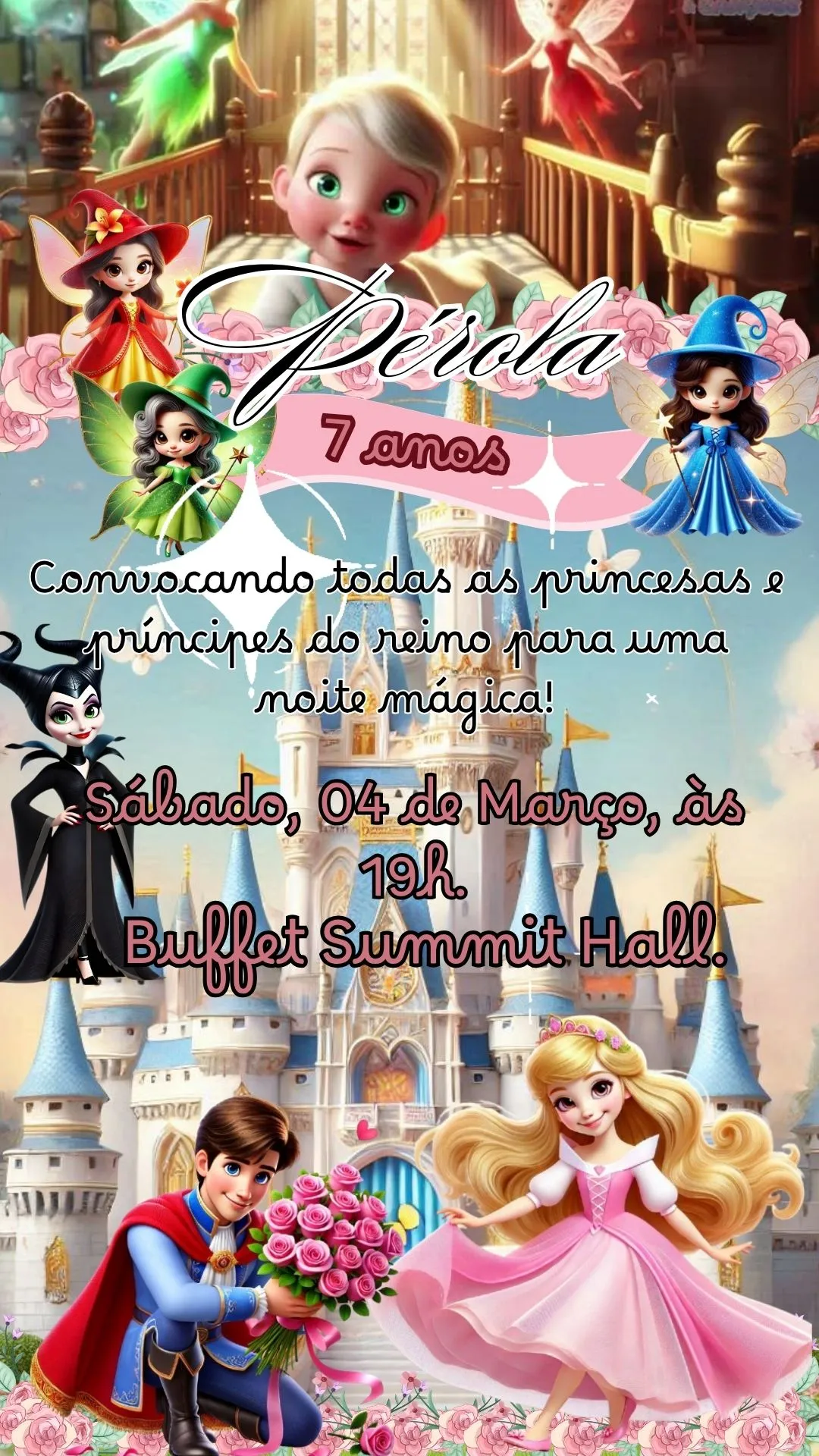 O design combina imagens adoráveis das princesas baby com cenários suaves e música delicada, criando um ambiente acolhedor que deixa os convidados ansiosos para a celebração.