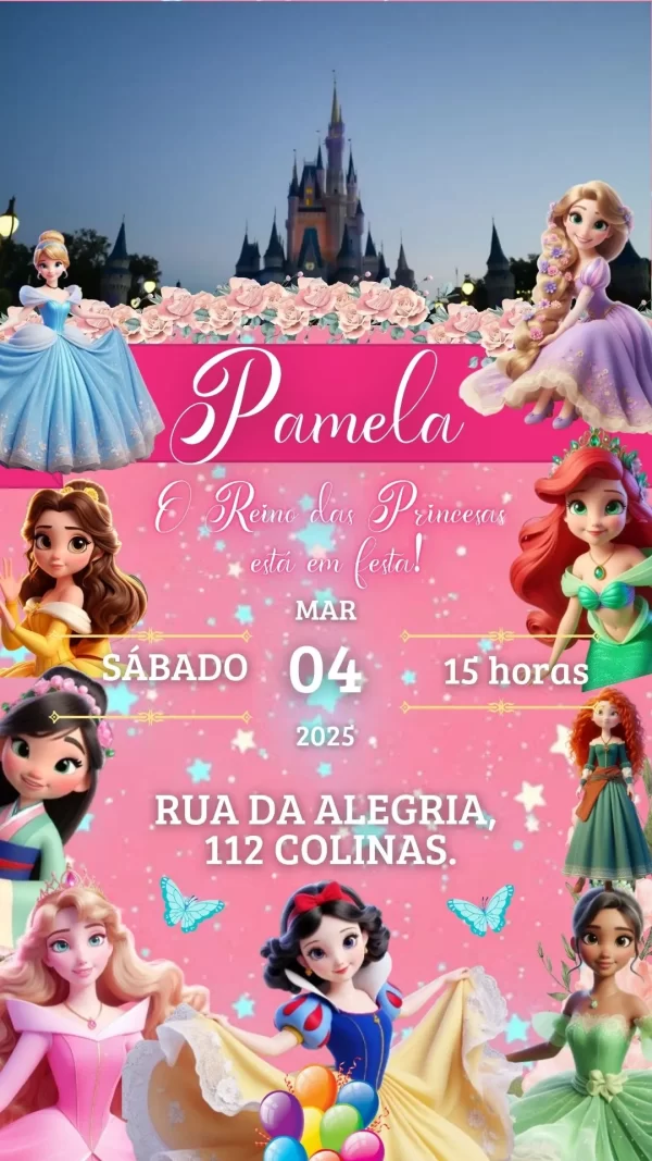 Vídeo convite animado no formato MP4 com tema princesas