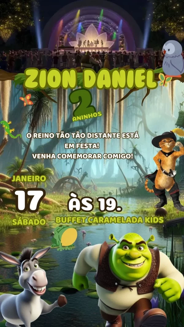 Com um visual vibrante, o vídeo apresenta elementos marcantes da franquia Shrek, como o Burro, a Princesa Fiona, o Gato de Botas e, claro, o próprio Shrek. Cada detalhe é pensado para despertar sorrisos e criar expectativa para o grande dia, tornando o momento do convite parte da diversão.
