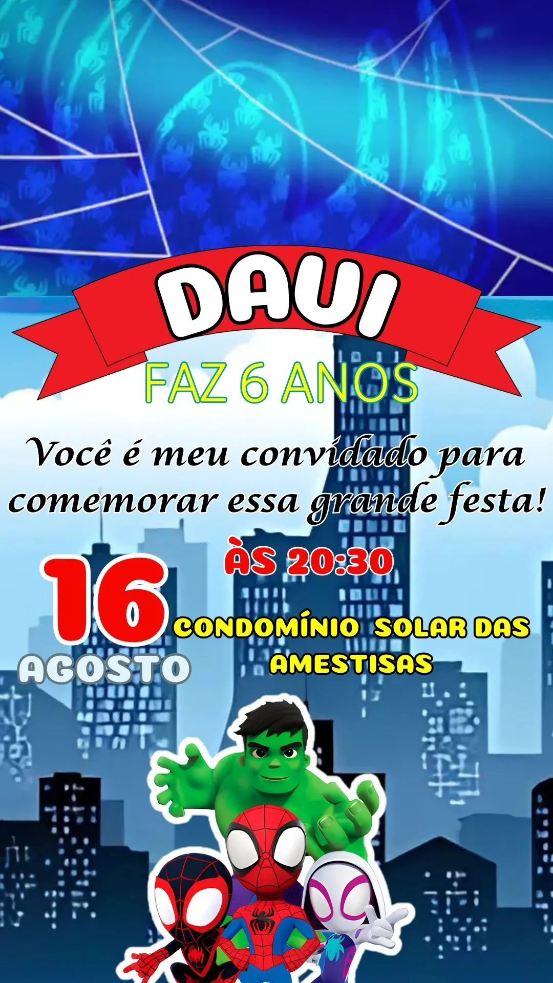 O convite é entregue em alta resolução, com movimentos ágeis, cores vibrantes e todo o espírito heroico que Spidey e sua turma representam. Cada detalhe foi pensado para transmitir energia e entusiasmo, tornando a experiência de receber o convite algo tão especial quanto o próprio evento.