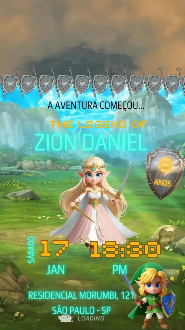 O convite animado The Legend of Zelda em vídeo MP4 é a escolha perfeita para fãs da famosa franquia de jogos e para quem deseja dar um toque épico e encantador à sua festa. Com inspiração no universo de Hyrule, o convite traz cenários mágicos, trilha sonora marcante e elementos icônicos como a Master Sword, o escudo de Link e a Triforce. Ideal para aniversários, eventos temáticos e encontros de fãs, este convite transforma a simples tarefa de chamar os convidados em uma experiência emocionante e memorável.