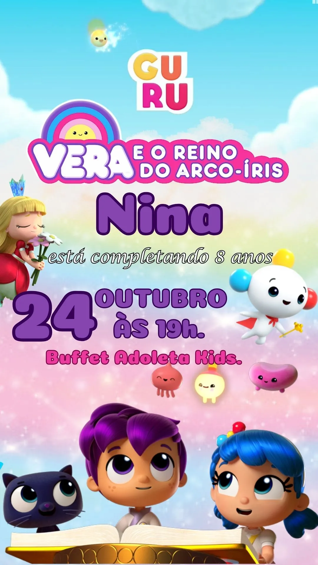 O convite animado Vera e o Reino do Arco-Íris em vídeo MP4 é a escolha ideal para quem deseja transformar o convite de aniversário em um momento mágico e cheio de cores. Inspirado na série infantil amada pelas crianças, esse modelo digital traz animações encantadoras, personagens fofos e um cenário vibrante que transmite alegria e imaginação.
