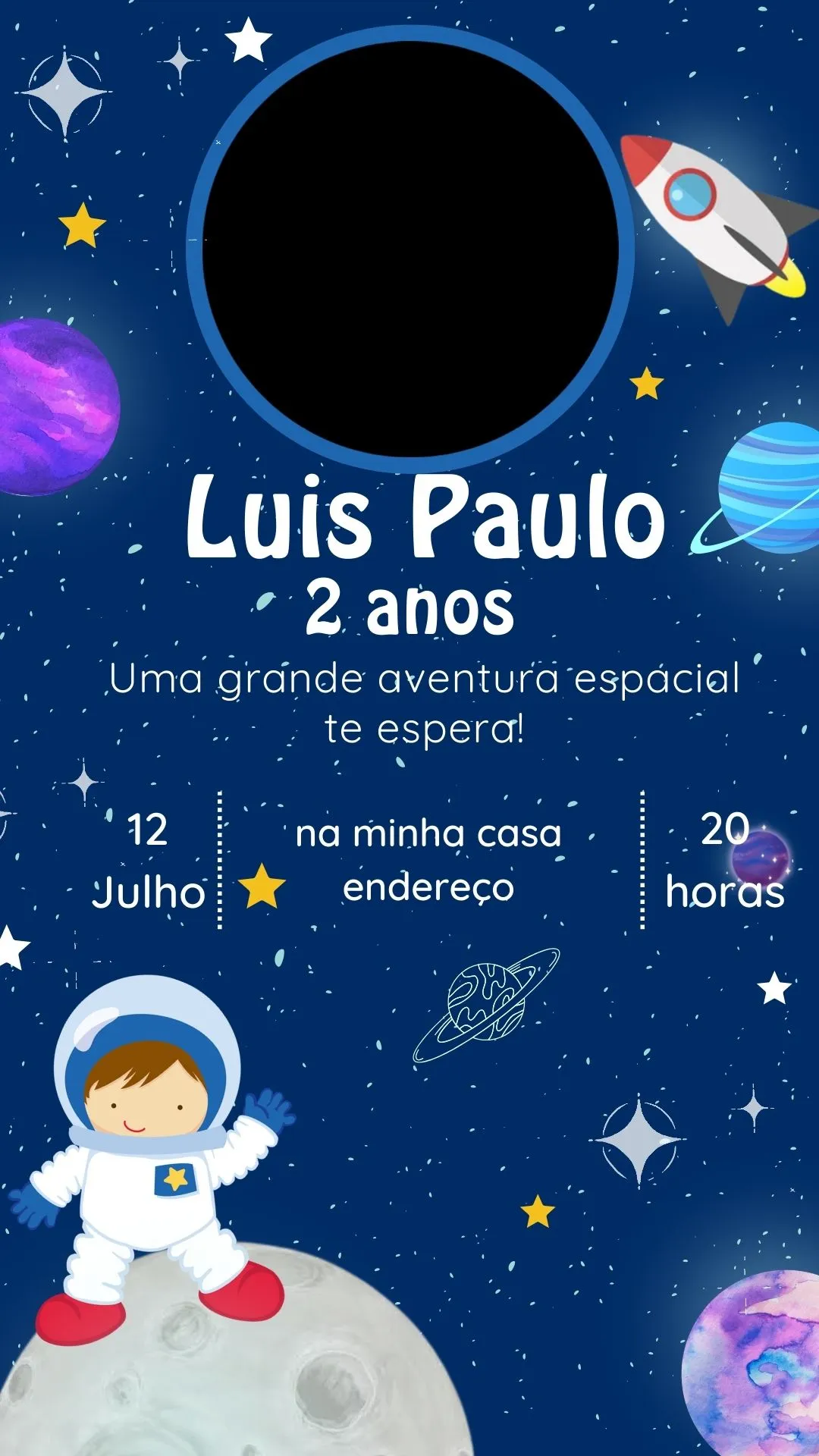 O Convite Virtual Animado Astronauta é ideal para transformar o convite da sua festa em uma verdadeira aventura pelo espaço. Inspirado no universo de exploração espacial, o convite traz cores vibrantes, efeitos animados de planetas, estrelas e foguetes, além de uma trilha sonora divertida que transporta os convidados para uma experiência única. Perfeito para aniversários infantis, festas temáticas e eventos escolares, este convite desperta curiosidade, emoção e expectativa desde o primeiro momento.