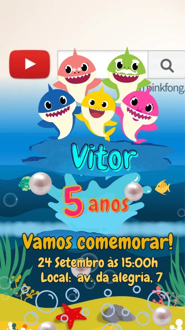 Vídeo convite animado no formato MP4 com tema Baby Shark;