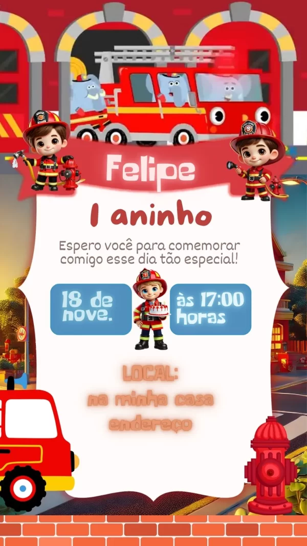 Com o Convite Virtual Animado Bombeiro, sua comemoração ganha um toque especial e memorável, mostrando desde o início que será um evento cheio de alegria e aventuras.