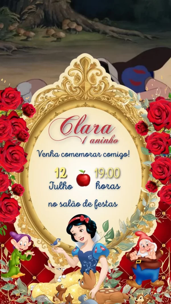 Os elementos animados da Branca de Neve e dos sete anões tornam cada segundo do convite especial, despertando a curiosidade e o encanto. Além disso, o arquivo em MP4 garante compatibilidade com praticamente qualquer dispositivo, facilitando o compartilhamento.