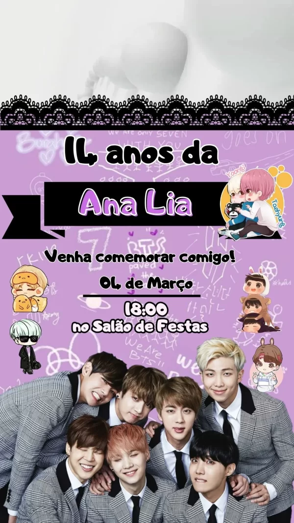 O Convite Virtual Animado BTS em Vídeo é a escolha perfeita para os fãs do grupo de K-pop mais famoso do mundo. Com inspiração nas cores, estilos e músicas do BTS, este convite digital vai deixar sua comemoração ainda mais marcante e única. Ideal para aniversários temáticos, festas de debutante ou qualquer evento onde a música e o glamour coreano sejam protagonistas, ele transforma o ato de convidar em uma experiência emocionante.