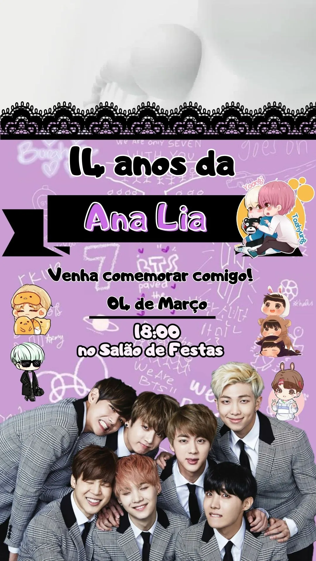Receba seu Convite Virtual Animado BTS em Vídeo personalizado em até 24 horas úteis;