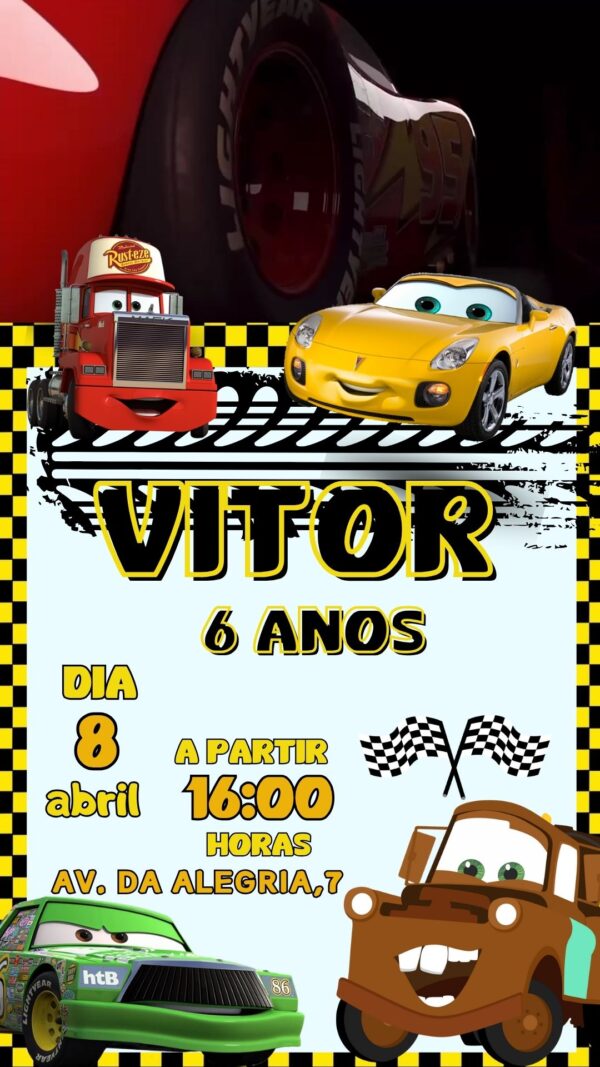 Com um visual moderno e cores vibrantes, o convite transmite a sensação de velocidade e emoção típica das pistas. As animações trazem os detalhes dos personagens, cenários icônicos e momentos marcantes do filme, deixando os convidados ansiosos pelo grande dia.