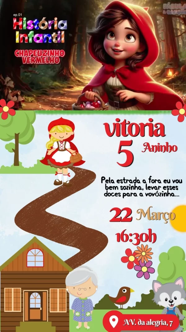 Ideal para aniversários infantis, chá de bebê ou até festas escolares, o convite combina cores vivas, elementos da natureza e animações que remetem à história original. Com ele, cada detalhe ganha vida: a cestinha, o caminho pela floresta, o encontro com a vovó e até a presença divertida do lobo.