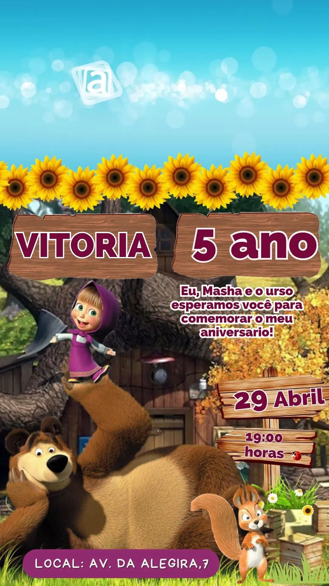 O Convite Virtual Animado Masha e o Urso em Vídeo MP4 é a escolha perfeita para transformar o anúncio da sua festa em um momento especial e encantador. Inspirado na famosa animação russa que conquistou crianças no mundo todo, este convite traz as aventuras divertidas de Masha e seu amigo Urso, repletas de cores vibrantes, música animada e um toque de humor que encanta crianças e adultos.