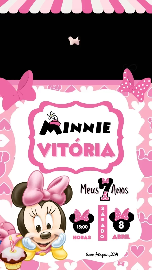 O convite virtual animado Minnie Rosa em vídeo MP4 é produzido com alta qualidade de imagem e som, garantindo que cada detalhe seja percebido com nitidez. As animações destacam os laços da Minnie, os cenários delicados e os elementos visuais em harmonia com a trilha sonora alegre, criando um convite que transmite amor e felicidade.