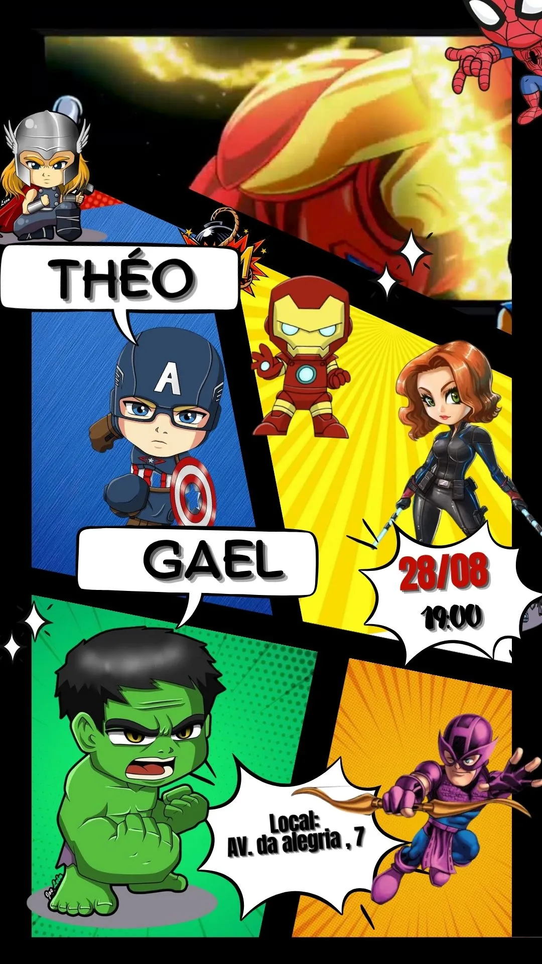 O convite é criado para transmitir toda a energia e emoção do mundo dos super-heróis. As animações rápidas, a música empolgante e os efeitos especiais remetem diretamente aos filmes, garantindo que cada convidado sinta a emoção de participar de uma missão especial.