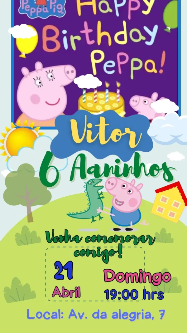 O Convite Virtual Animado Peppa Pig não é apenas um convite, mas uma forma divertida de envolver seus convidados e transmitir a alegria da celebração. O convite traz elementos visuais que encantam crianças e familiares, garantindo que todos entrem no clima da festa desde o primeiro momento.