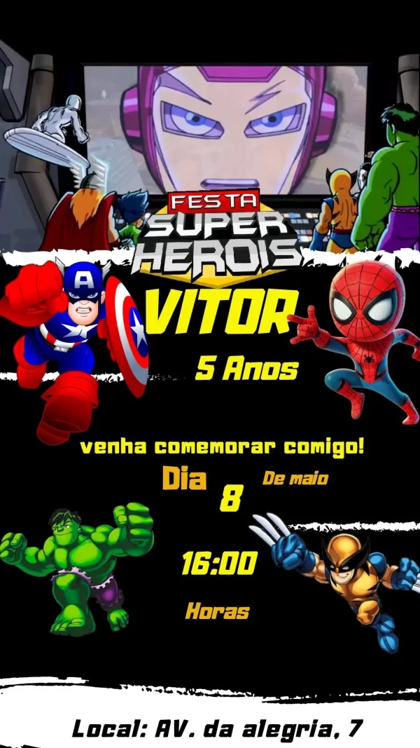 O Convite Virtual Animado Super Heróis em Vídeo MP4 é a escolha ideal para quem deseja transformar o convite em parte da diversão. Inspirado nos personagens mais amados do universo dos quadrinhos e do cinema, ele traz toda a energia, coragem e ação para anunciar o seu evento. Seja com heróis da Marvel, da DC ou combinações criativas, este convite é perfeito para aniversários, festas temáticas e eventos especiais que merecem um toque de aventura.