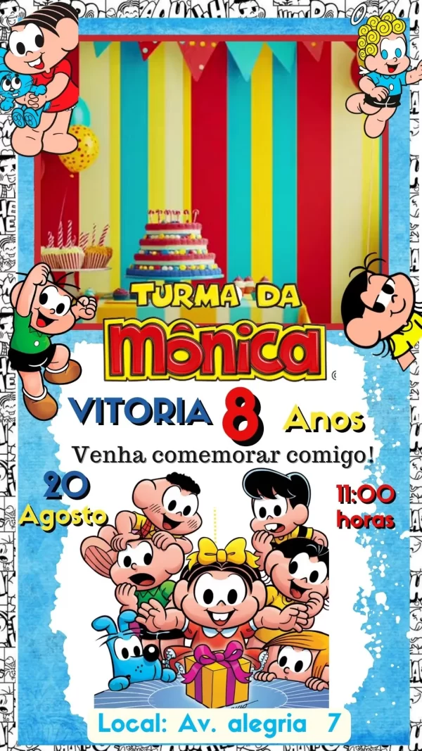 Ideal para aniversários infantis e eventos temáticos, o convite virtual animado Turma da Mônica em vídeo MP4 conquista crianças e adultos, unindo nostalgia e diversão. Além de prático, ele é totalmente personalizável, garantindo que cada detalhe esteja alinhado com o seu evento.