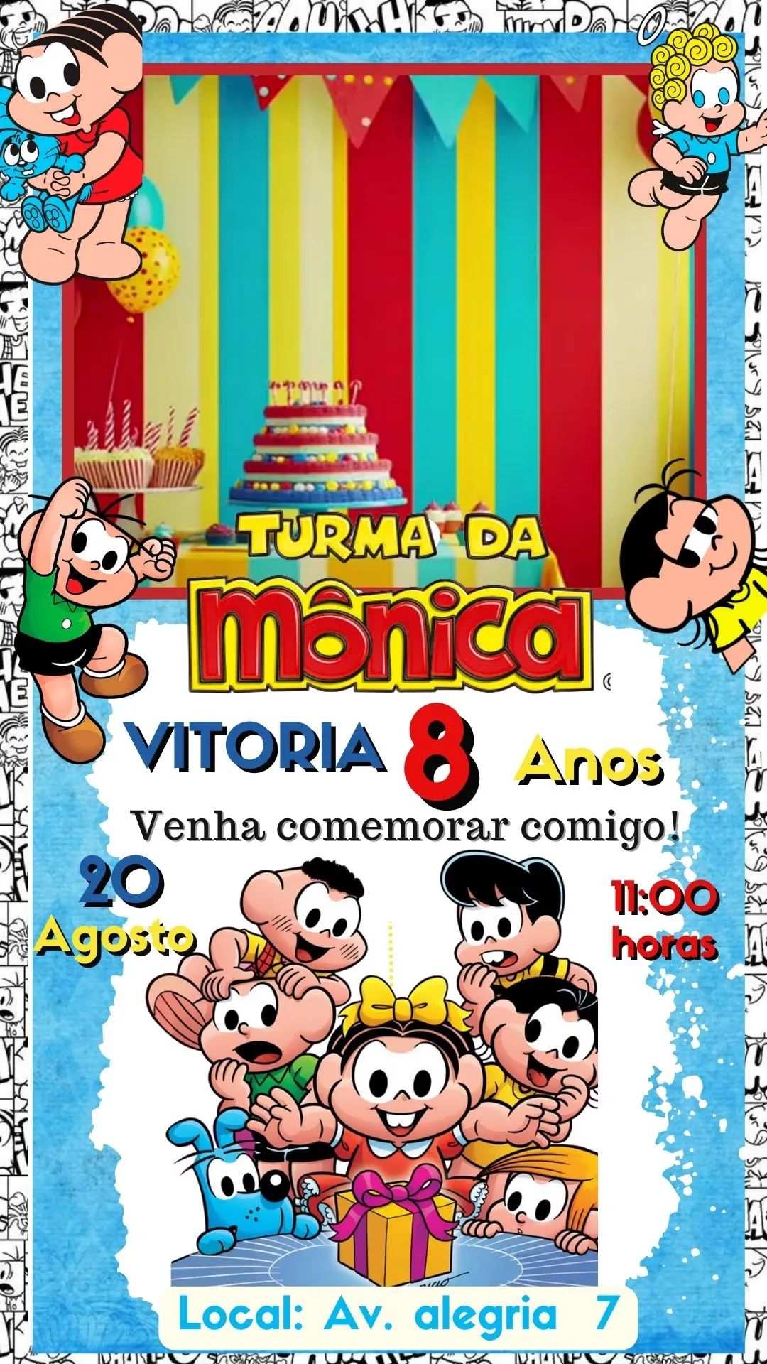 O convite virtual animado Turma da Mônica em vídeo MP4 é perfeito para transformar o anúncio da sua festa em um momento especial e cheio de emoção. Inspirado nos personagens criados por Mauricio de Sousa, este convite digital traz toda a alegria e o carisma de Mônica, Cebolinha, Magali, Cascão e seus amigos. Com animações coloridas, músicas divertidas e um design encantador, o convite já coloca seus convidados no clima da comemoração desde o primeiro segundo.