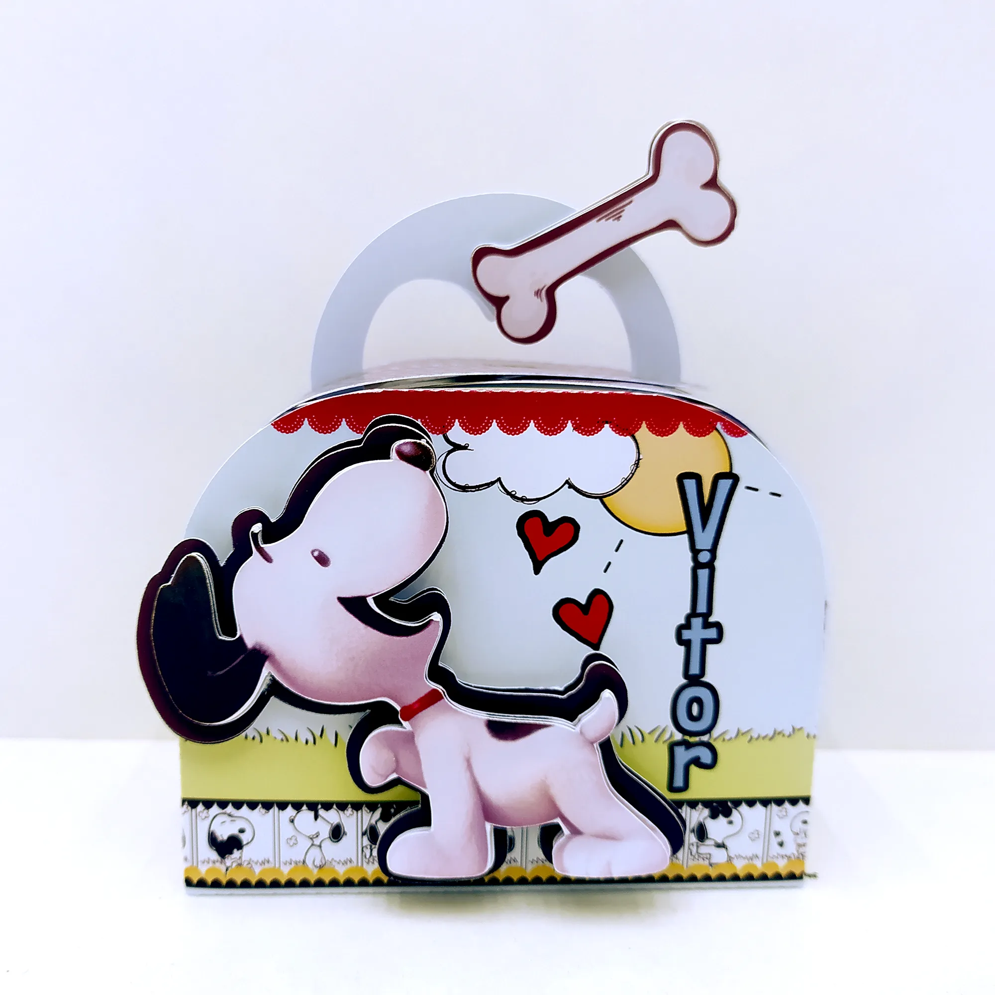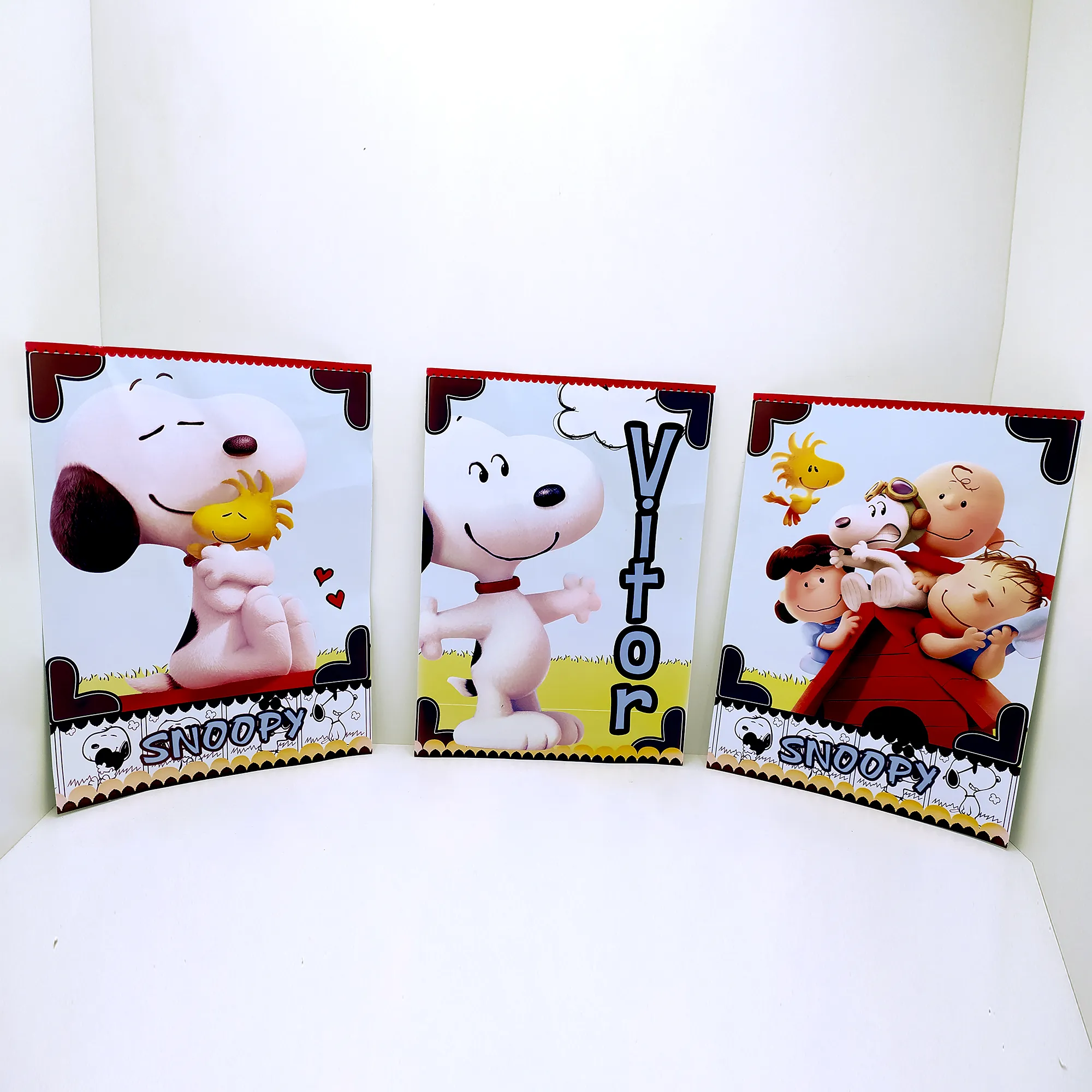 Ilustrações de Snoopy, Woodstock e elementos clássicos do tema;