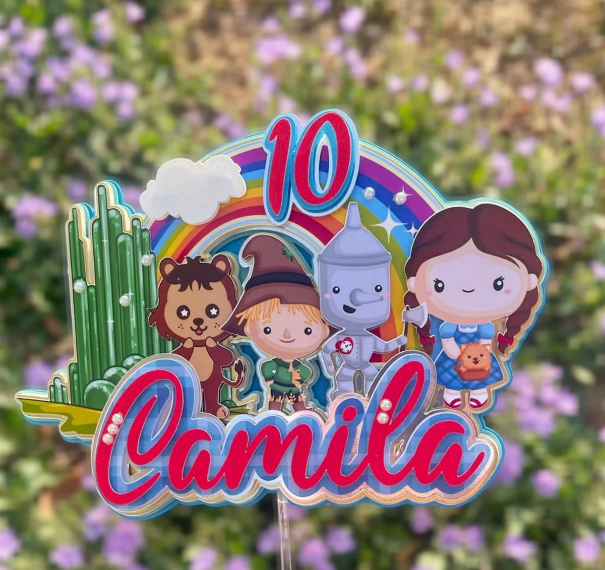 O tema Mágico de Oz encanta pela combinação de cores alegres e personagens inesquecíveis. Este topo de bolo traz Dorothy, o Espantalho, o Homem de Lata e o Leão, compondo uma decoração perfeita para festas criativas e cheias de alegria.