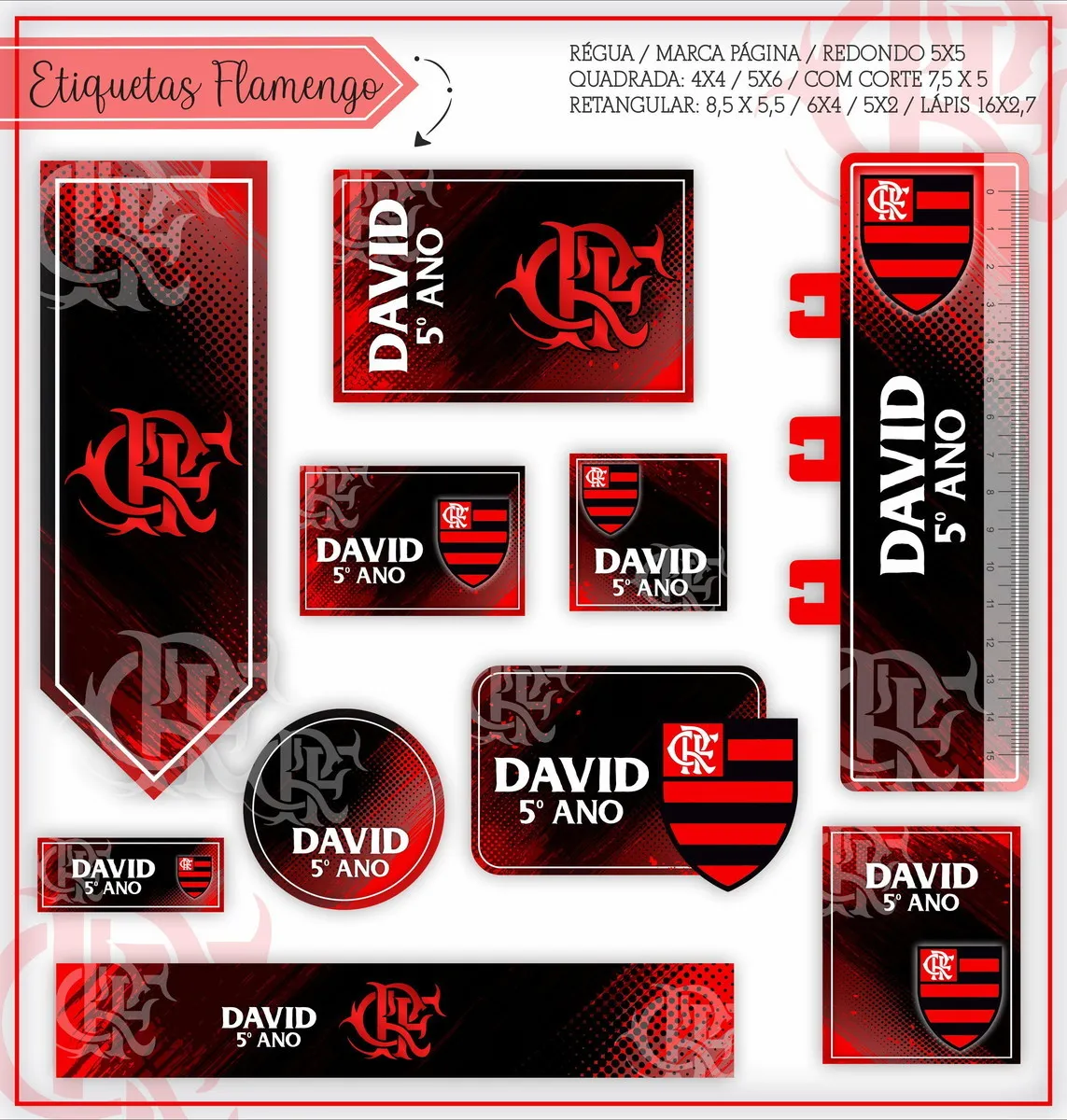 Flamengo: Se você busca uma identidade visual que reúna o escudo oficial, as cores rubro-negras e um design moderno, este modelo é a escolha certa. Além disso, este design destaca-se pela sua força visual, permitindo que você crie itens personalizados para diversas festas de volta às aulas e uso cotidiano.