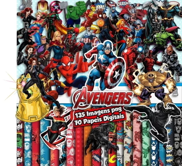 Reúna seus heróis favoritos com o poderoso Kit Digital Scrapbook e Cliparts Avengers! Com imagens em PNG com fundo transparente e papéis digitais temáticos, este kit é perfeito para festas, papelaria personalizada, planners, etiquetas escolares e projetos criativos com a turma dos Vingadores.