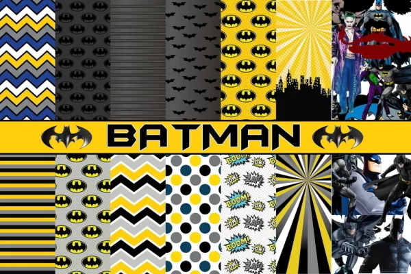 Papéis digitais temáticos com símbolos, cores e elementos do universo do Batman