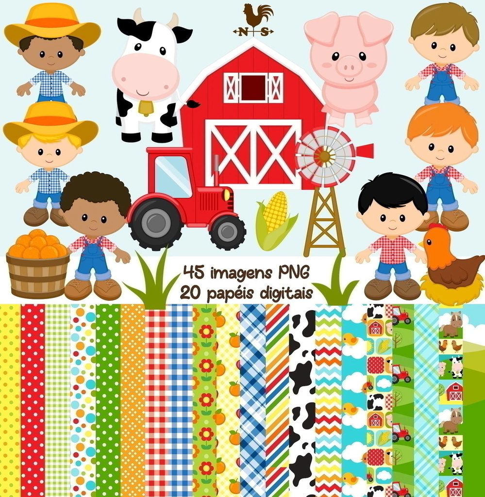 Crie projetos encantadores com o Kit Digital Scrapbook e Cliparts Fazendinha! Ideal para festas infantis, papelaria personalizada e etiquetas escolares, este kit traz cliparts em PNG com fundo transparente e papéis digitais com o charme do campo: vaquinhas, cavalos, celeiros, tratores e muito mais.