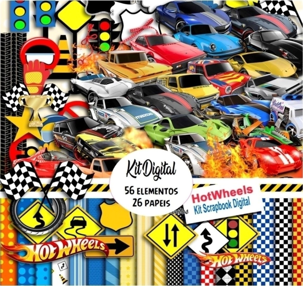 Leve velocidade e adrenalina para seus projetos com o Kit Digital Scrapbook e Cliparts Hot Wheels! Este pacote contém imagens em PNG com fundo transparente e papéis digitais temáticos, perfeitos para criar convites, lembrancinhas, planners, etiquetas escolares e muito mais.