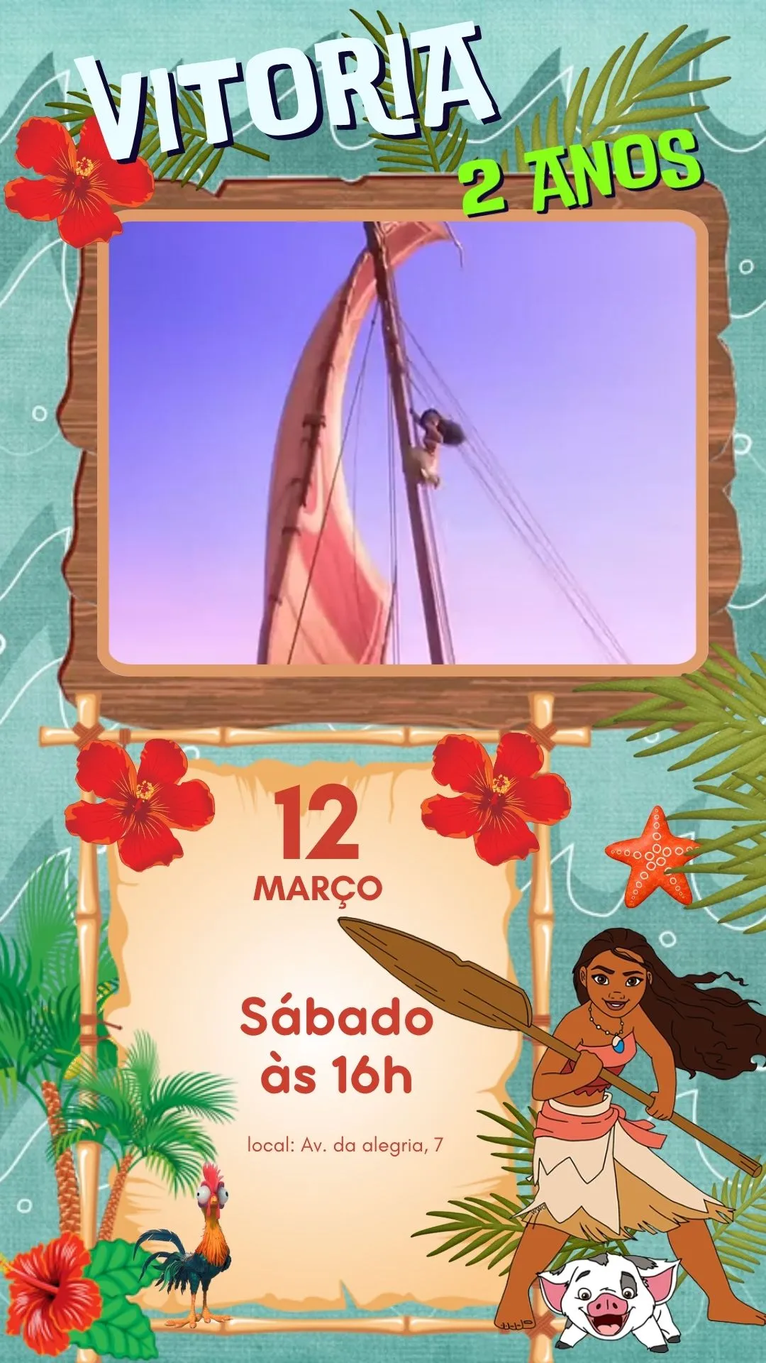 Com design vibrante, trilha sonora envolvente e animações cheias de movimento, este convite conquista adultos e crianças. Cada detalhe foi pensado para transportar os convidados diretamente para o mundo mágico de Motunui, com conchas, coqueiros e o famoso barco de Moana navegando rumo à grande festa.