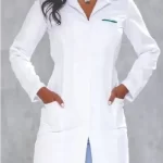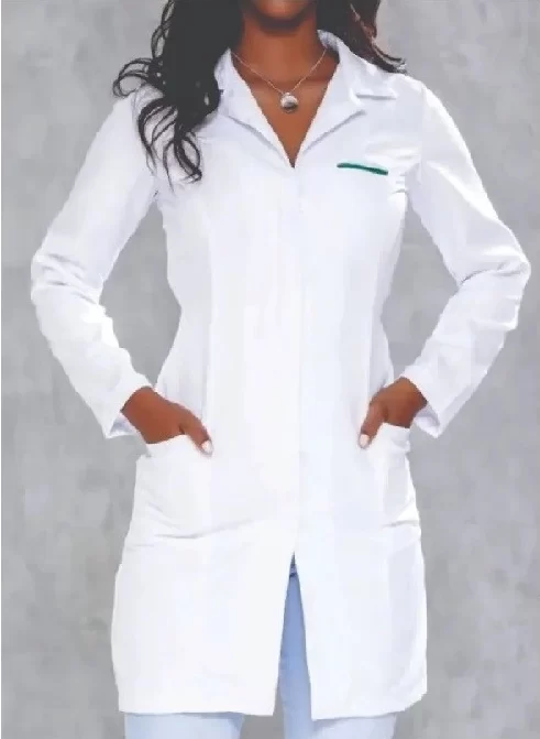 Modelagem detalhada do jaleco feminino tradicional com gola e bolsos