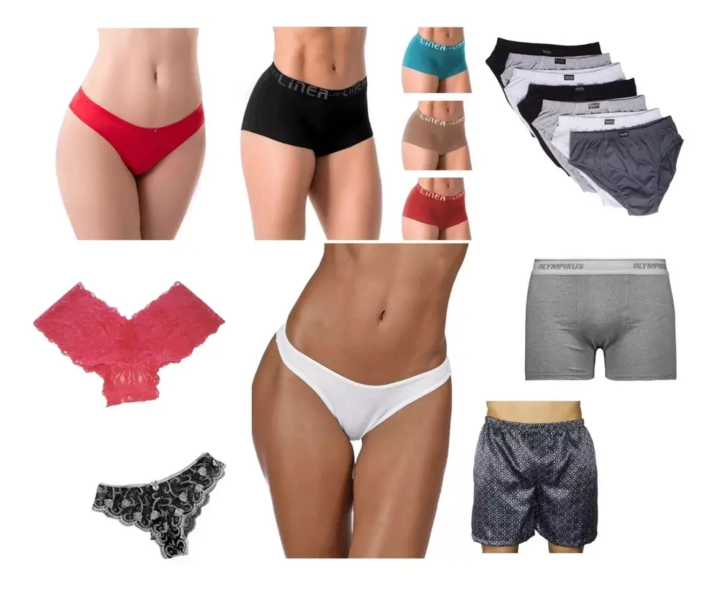 Diversos modelos de calcinhas femininas e cuecas masculinas