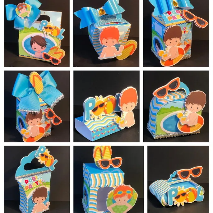 A experiência de uso é projetada para ser eficiente e prática. Cada um dos 4 arquivos do pack foi desenhado com linhas de vinco claras e peças separadas em grupos lógicos, o que torna a montagem bastante legível e acessível. Este pack será enviado automaticamente via e-mail após a confirmação da compra. Deste modo, a produção da decoração Topper de Bolo Pool Party e das caixas pode ser iniciada imediatamente.