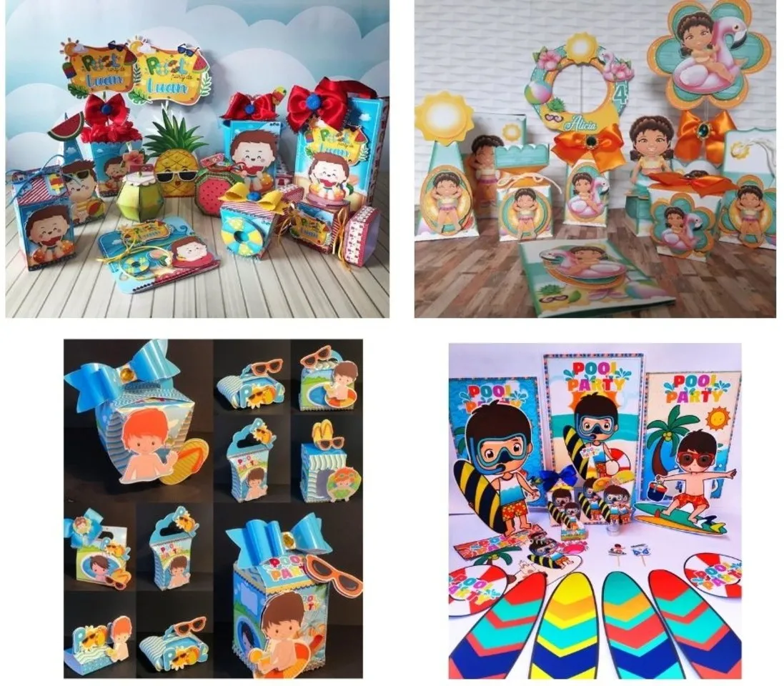 Este não é um arquivo simples; é um Pack 4 Arquivo de Corte Combo Pool Party que oferece uma solução coordenada para a decoração: