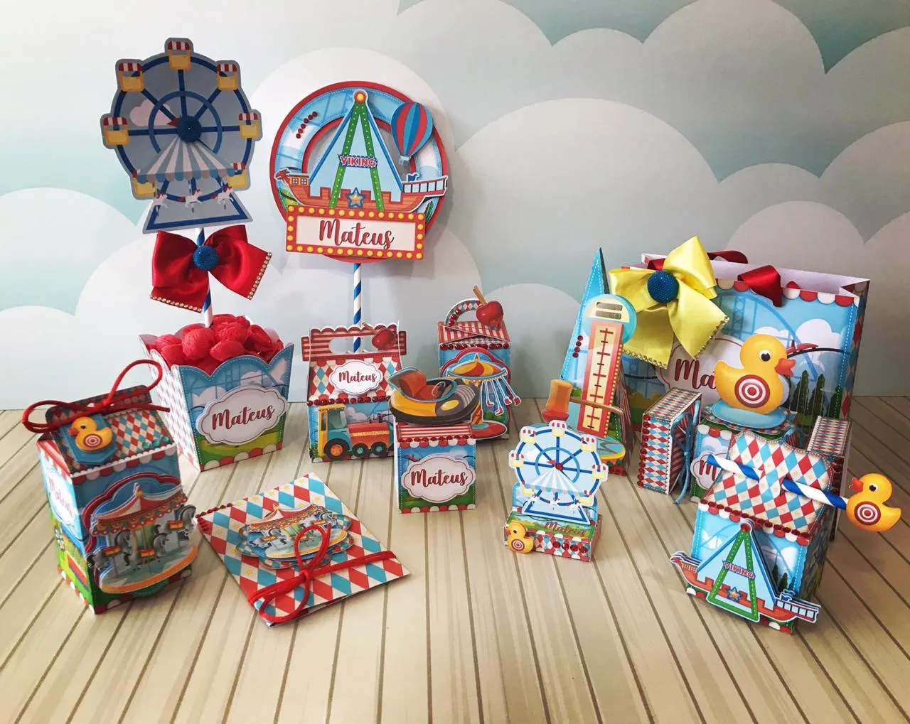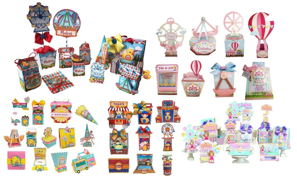 O conteúdo do combo inclui 5 moldes de caixas e elementos diferentes, como Caixa Roda Gigante, Caixa Carrossel, Caixa Pipoca, Caixa Bilheteria, etc., além, é claro, de um Topper de Bolo temático. Esta variedade garante que todos os tipos de doces e lembrancinhas sejam contemplados, e que a inclusão do nome e da idade da criança possa ser facilmente realizada no programa gratuito Silhouette Studio.