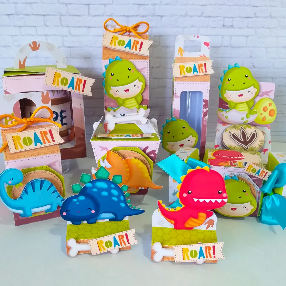 O conteúdo deste combo inclui 6 moldes de caixas e elementos diferentes, como Caixa Dinossauro Egg (Ovo), Caixa Milk, Caixa Tenda (Teepee), Caixa Sushi, além de toppers e o Topper de Bolo principal. Esta variedade garante que todos os tipos de doces e lembrancinhas sejam contemplados, e que a inclusão do nome e da idade da criança possa ser facilmente realizada no programa gratuito Silhouette Studio.