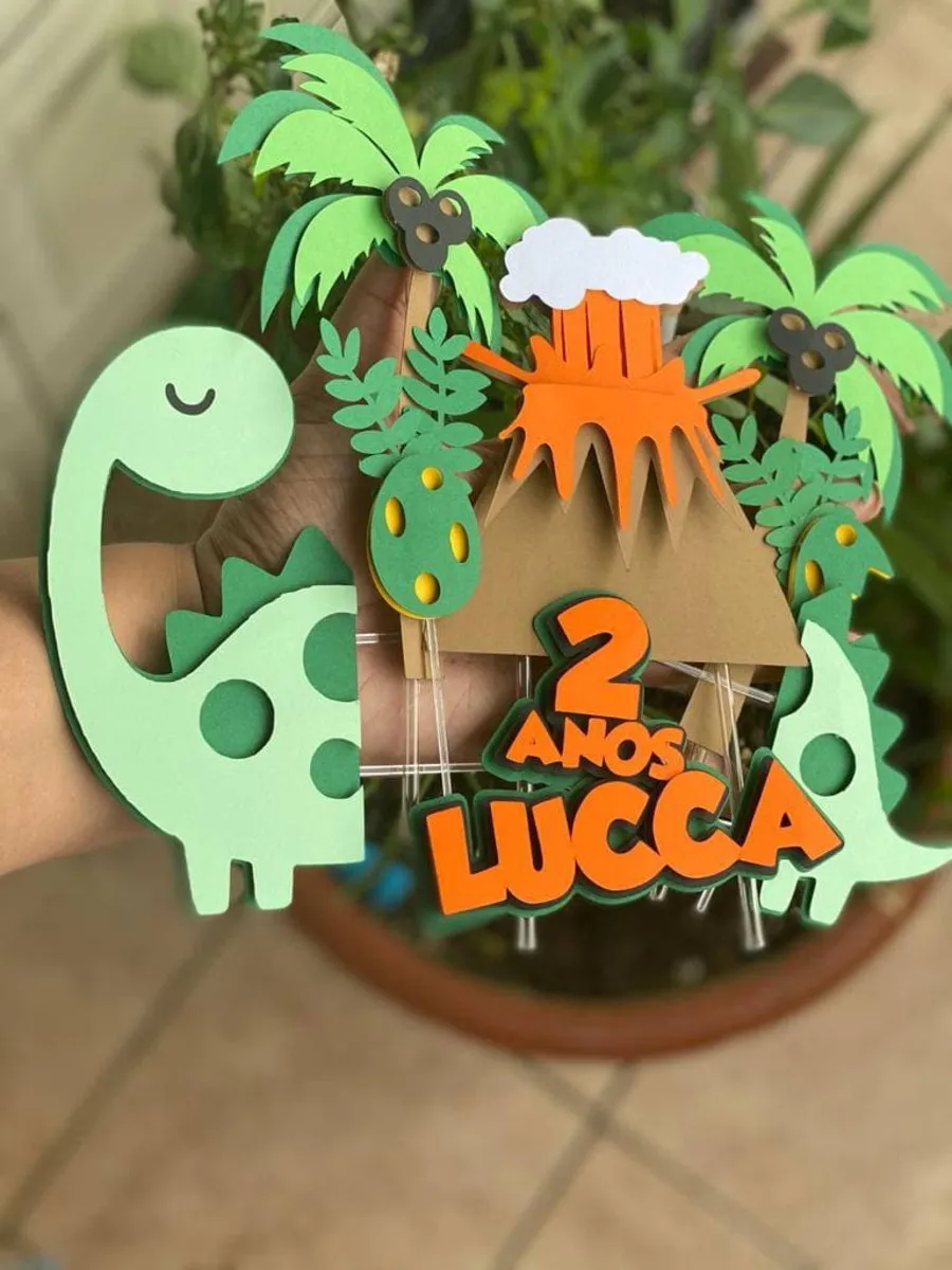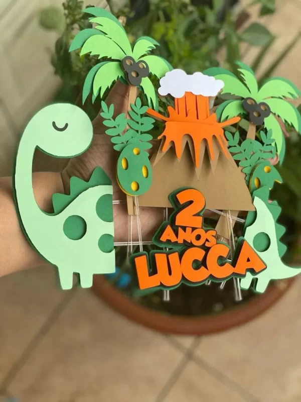 Além disso, você pode combinar o topper com elementos de floresta, vulcões, ovos de dinossauro e balões coloridos, criando um cenário completo e imersivo. Dessa forma, cada convidado se sente dentro de uma verdadeira aventura pré-histórica.