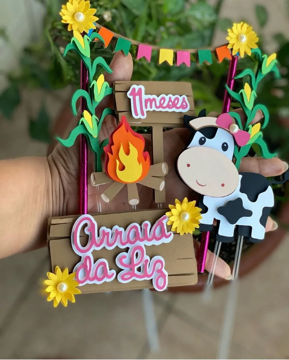 Com elementos inspirados no universo caipira — como bandeirinhas, fogueira, chapéu de palha e uma vaquinha adorável — este topo de bolo transforma qualquer mesa em um verdadeiro arraiá temático.
